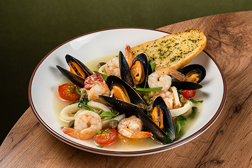 И, конечно, Mare Caldo - «тёплое море» с креветками, кальмарами и мидиями, где каждая ложка напоминает о вечерней набережной где-нибудь в Лигурии.